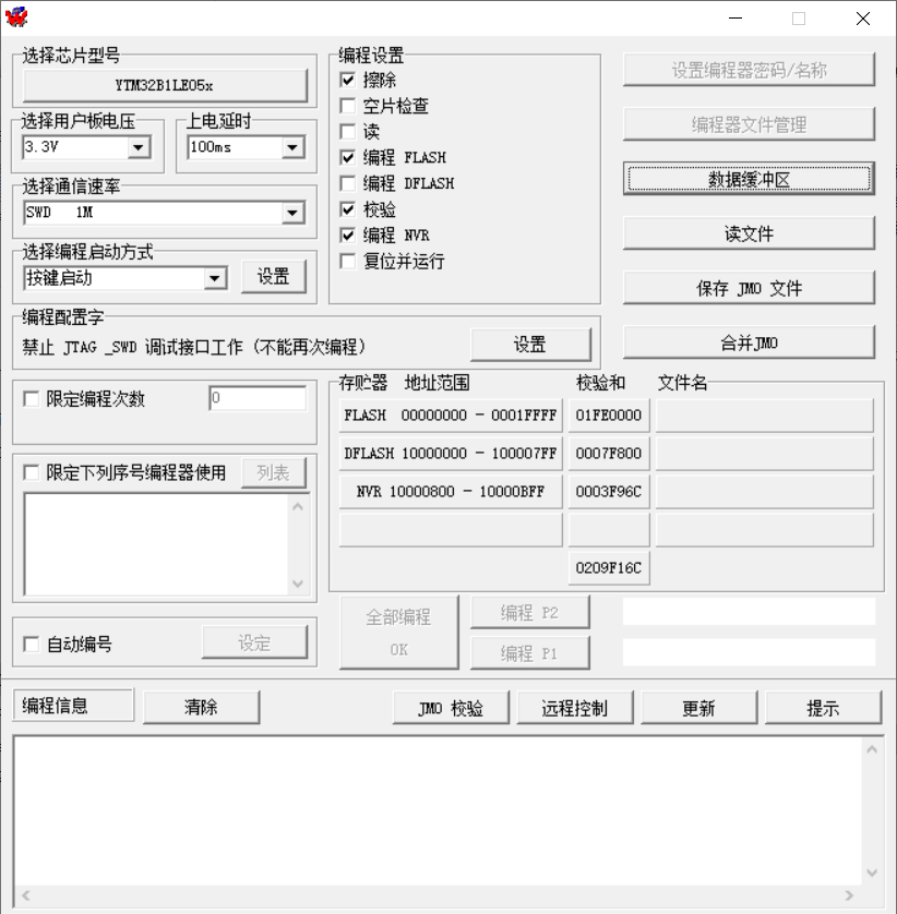 JMaster3烧录平台新增对YTMicro云图-YTM32B1LE0、YTM32B1MD1、YTM32B1ME0系列的烧录支持,支持SWD接口,最高速率10MHz,包括: |